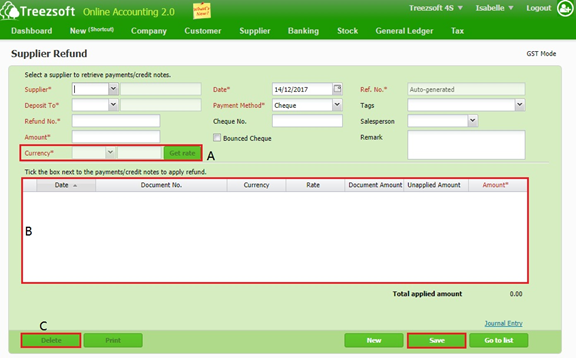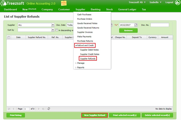 In daily business operation, there may be times that you've overpaid your supplier or you will have to off-set against the unapplied amount for supplier payment and credit notes. In such cases, you will need to record those amount as refund made by your supplier in your TreezSoft cloud accounting account.