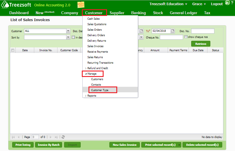 To edit or create customer types, navigate through: Customer > Manage > Customer Type.