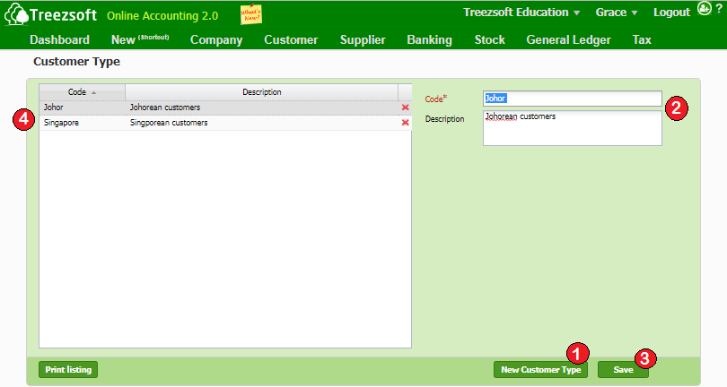 When entering your list of customers, you may want to categorize them so that you can identify them easier. TreezSoft allows you to group their customers according to types that they define themselves. You can easily created any types of grouping for your customers. TreezSoft even allows you to link your customers to multiple types.