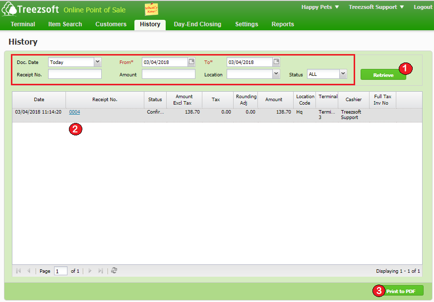 2. The list of previous sales will be shown here. Click on the hyperlinked Receipt No. to view detail of the sales.