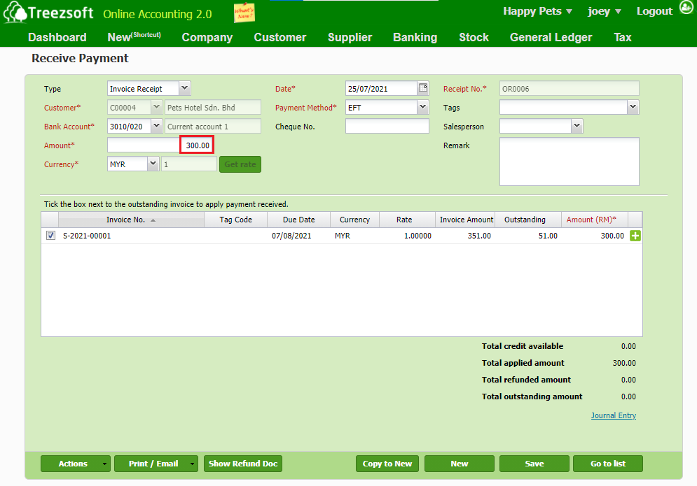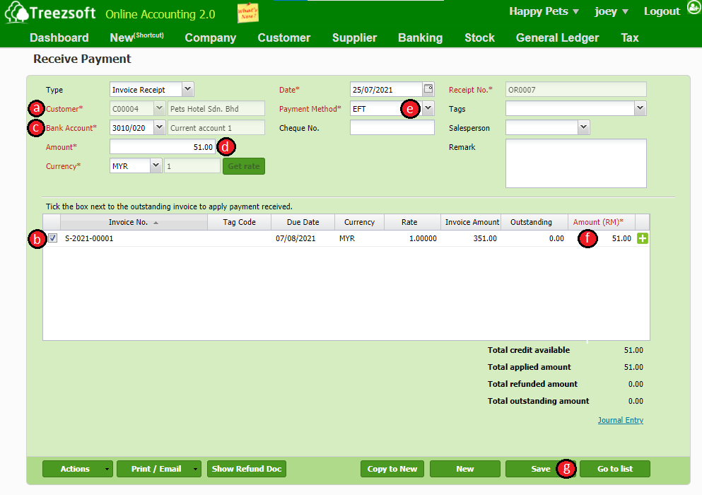 b. Tick on the box of specific outstanding invoice to apply payment received