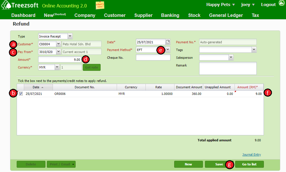 3. Overpayment of RM 9.00 from customer (Pets Hotel Sdn. Bhd.). Create a refund to record down the transaction.