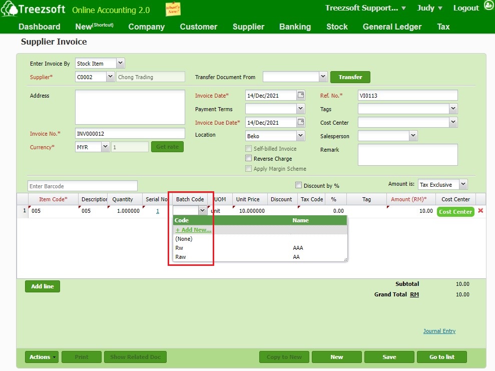 Step 3: Select the stock batch when raising related stock transactions. For example, when raising supplier invoices, select the respective stock batch required as shown below.