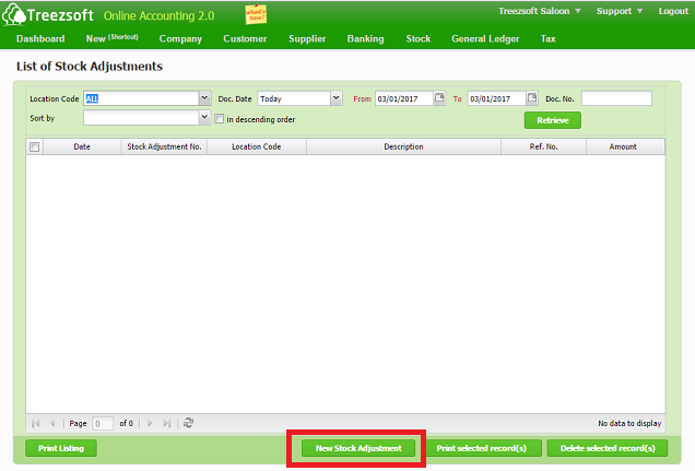 You will enter list of stock adjustments as below. Click on "New Stock Adjustment" to create new stock adjustment.