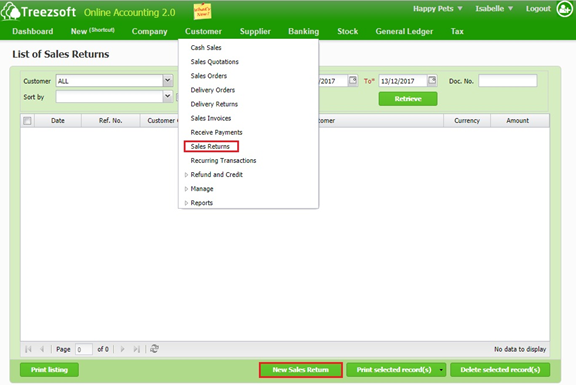 You can easily create a new sales returns by navigating through: Customer > Sales Returns. Click on the “New Sales Return” button at the bottom right corner.