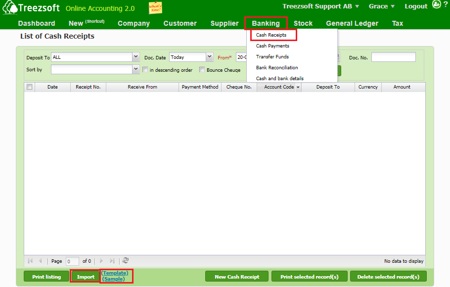 Click on the (Templates) hyperlink to download the template for cash receipts. Click on Import after you have done entering all details in the template provided.