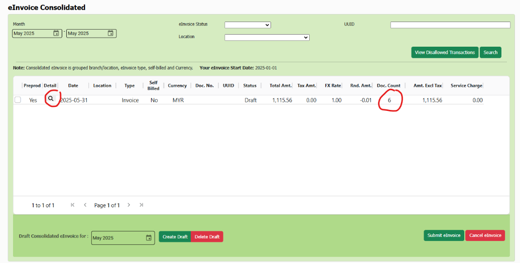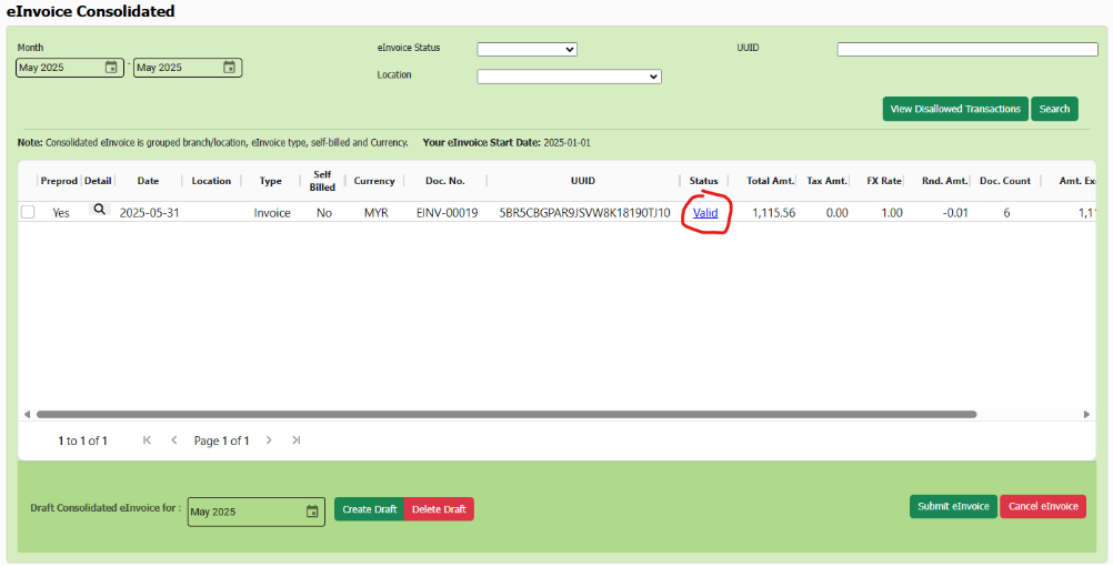 - Selepas itu, sebarang transaksi yang membenarkan konsolidasi eInvois akan dimasukkan ke dalam "draf konsolidasi eInvois" dan dipaparkan dengan sewajarnya.